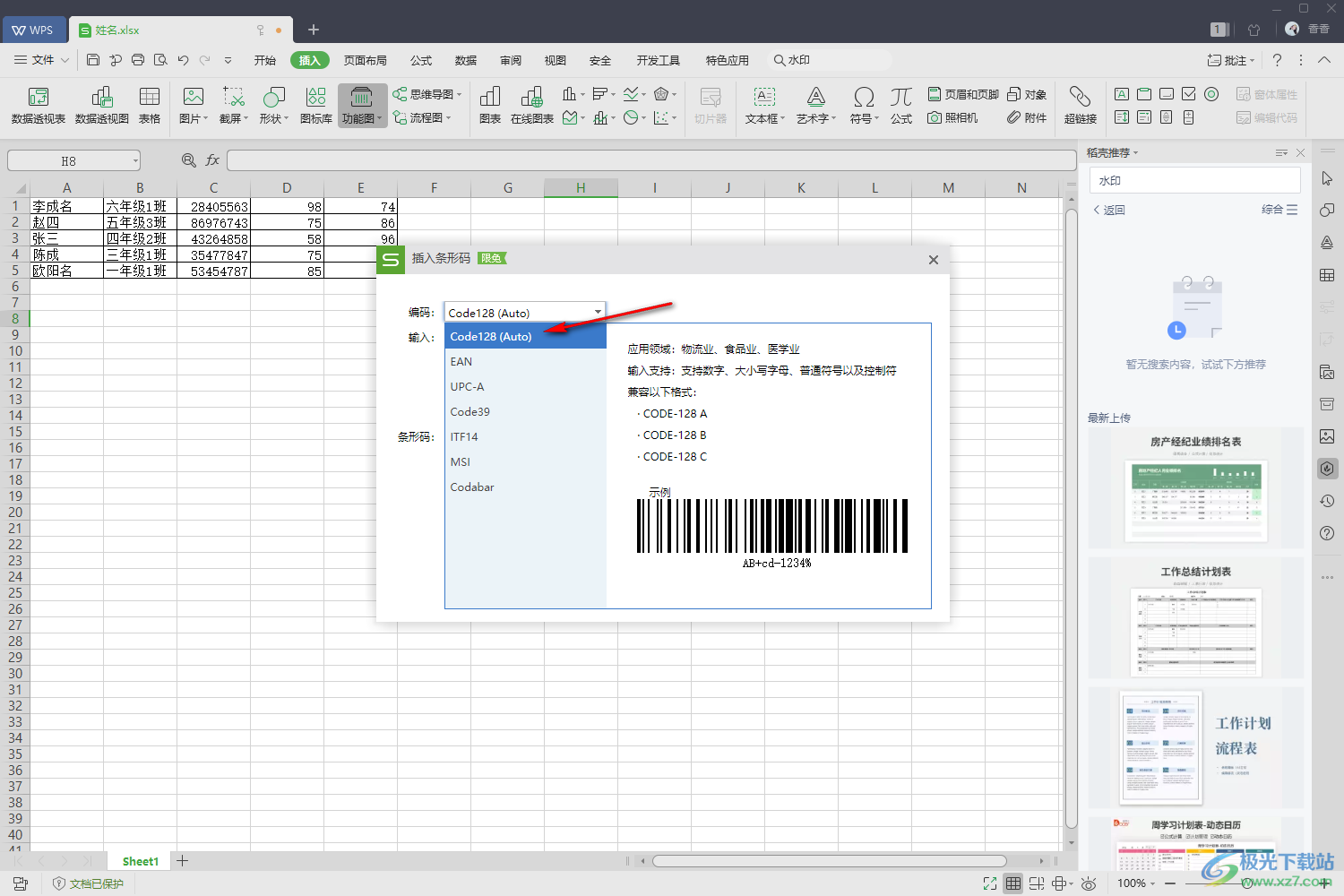 3.然后在表格页面中就会弹出一个插入条形码的窗口,在该窗口中,你可以将【编码】的下拉按钮点击打开,可以有多种编码的样式可以选择,根据自己的需要来选择编码样式。