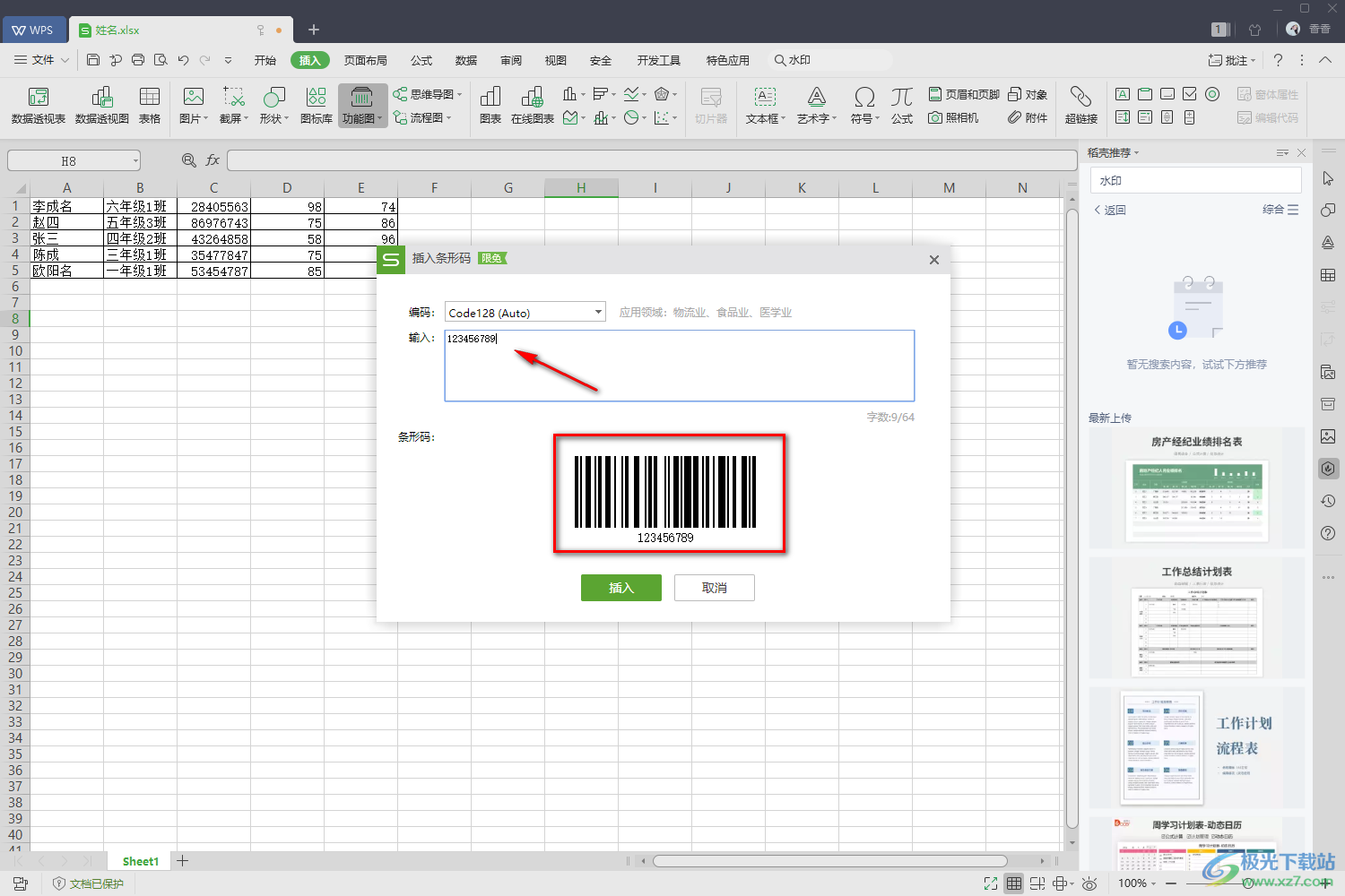 4.选择好样式之后,那么还需要在【输入】的框中编辑自己想要插入的内容,当你编辑好内容之后,下方的条形码就会显示出你编辑的内容,会有一个预览样式,设置好之后点击插入按钮即可。