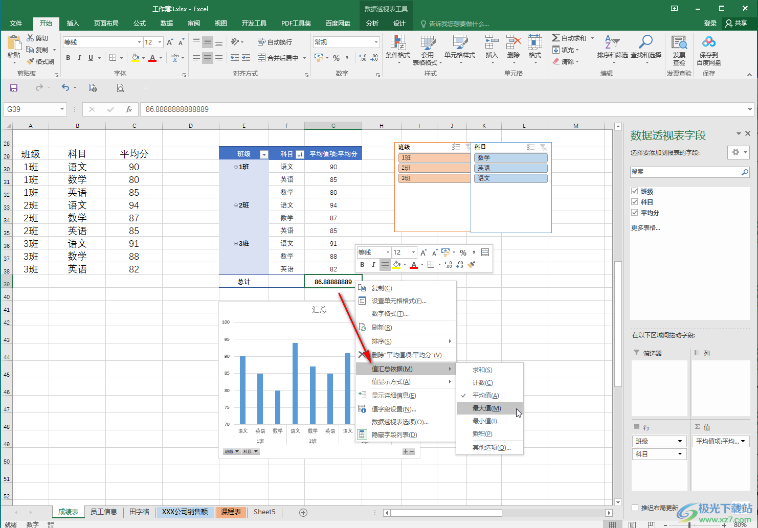 第四步:右键点击后,我们还可以设置值汇总依据等等;