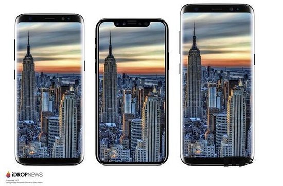 iDrop News还设计了一些渲染图,以帮助更好地对比上述尺寸。如图所示,iPhone8尺寸正好位于iPhone7和iPhone7Plus之间。显然,由于全面屏设计,iPhone8的屏幕尺寸更接近iPhone7Plus。另外,设计者还将iPhone8同三星S8和S8+做了对比,可以看到iPhone8比两者都小。