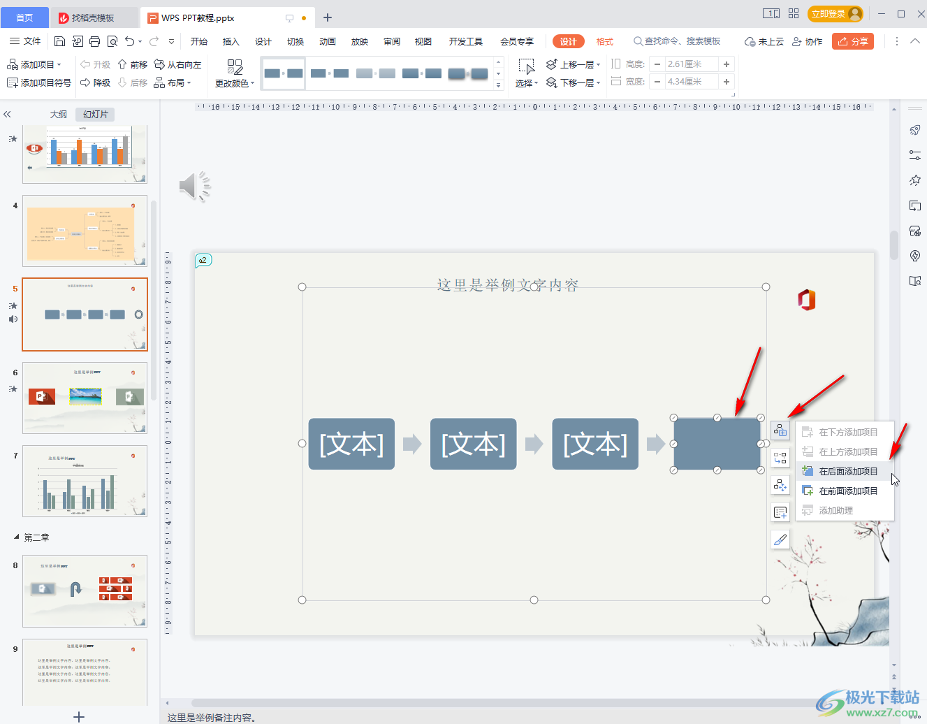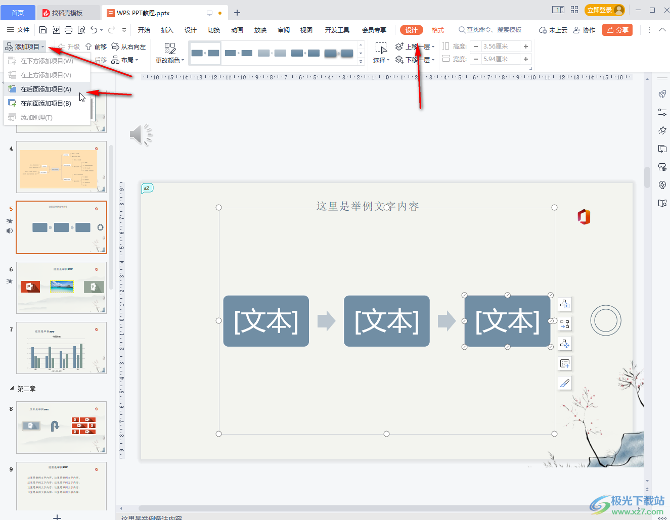 第三步:方法1.插入后,点击选中一个图形,在自动出现的图形设计栏,点击“添加项目”按钮并在子选项中设置在前面添加或者在后面添加就可以了;