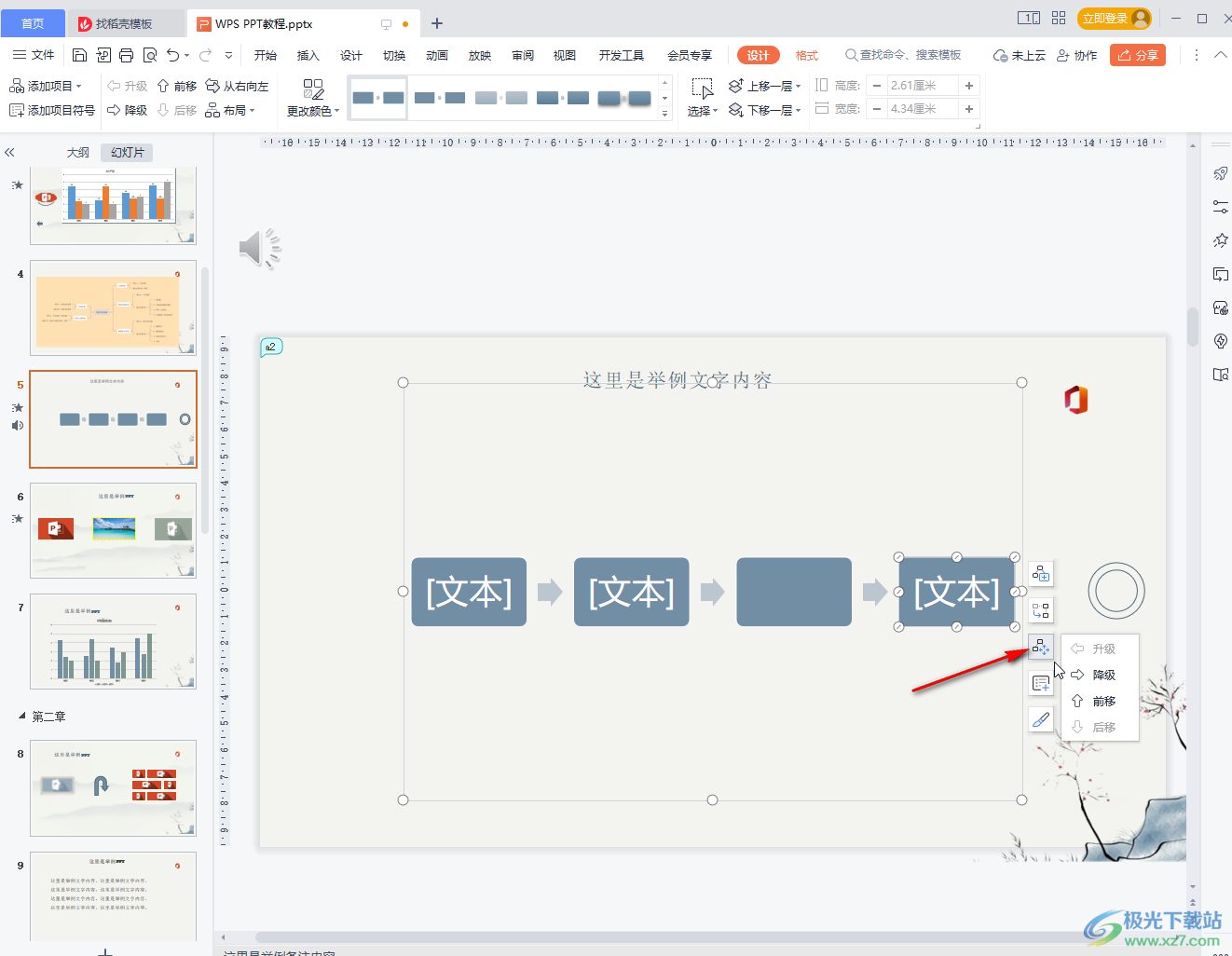 第五步:在浮动工具栏中我们还可以设置升级降级,前移后移等等。