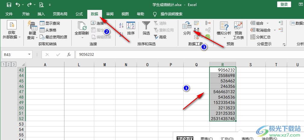2、第二步,进入Word页面之后,我们先在表格中选择需要删除后几位数字的数据,然后在工具栏中点击打开“数据”工具,接着在子工具栏中打开“分列”选项