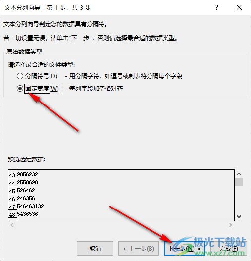 3、第三步,打开分列选项之后,我们在文本分列向导的第一页中选择“固定宽度”选项,再点击下一步选项