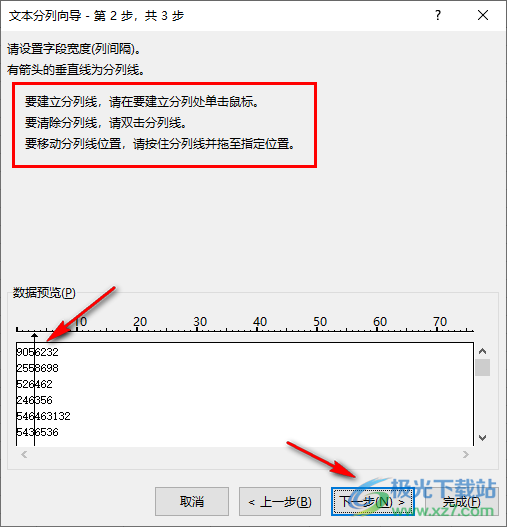 4、第四步,进入第2步向导页面之后,我们根据上方的提示,在数据中合适的位置添加一个分列线,然后点击“下一步”选项