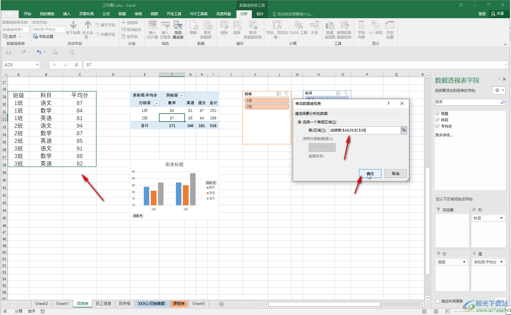 第二步:插入后点击定位到数据透视表任意单元格,系统上方会自动出现“数据透视表工具”,点击其中的“分析”;