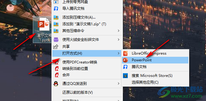 1、第一步,我们先在电脑中找到一个演示文稿,然后右键单击选择“打开方式”,再在打开方式的列表中点击“powerpoint”选项