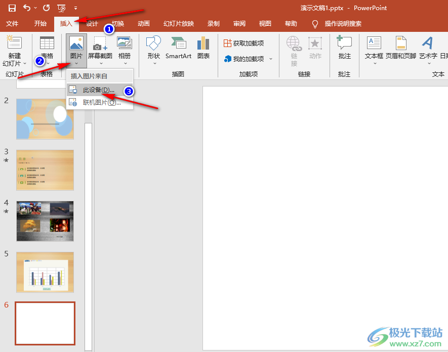 2、第二步,进入PPT页面之后,我们在页面上方的工具栏中找到“插入”工具,点击打开该工具并在子工具栏中打开“图片”选项,选择“此设备”