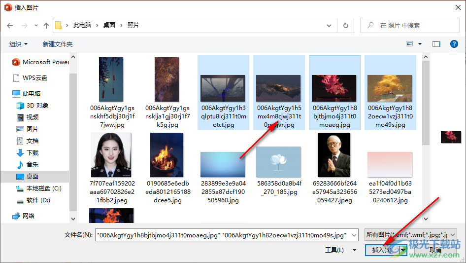 3、第三步,进入文件夹页面之后,我们在该页面中按住“Ctrl”键选择多张自己需要的图片,然后点击“插入”选项