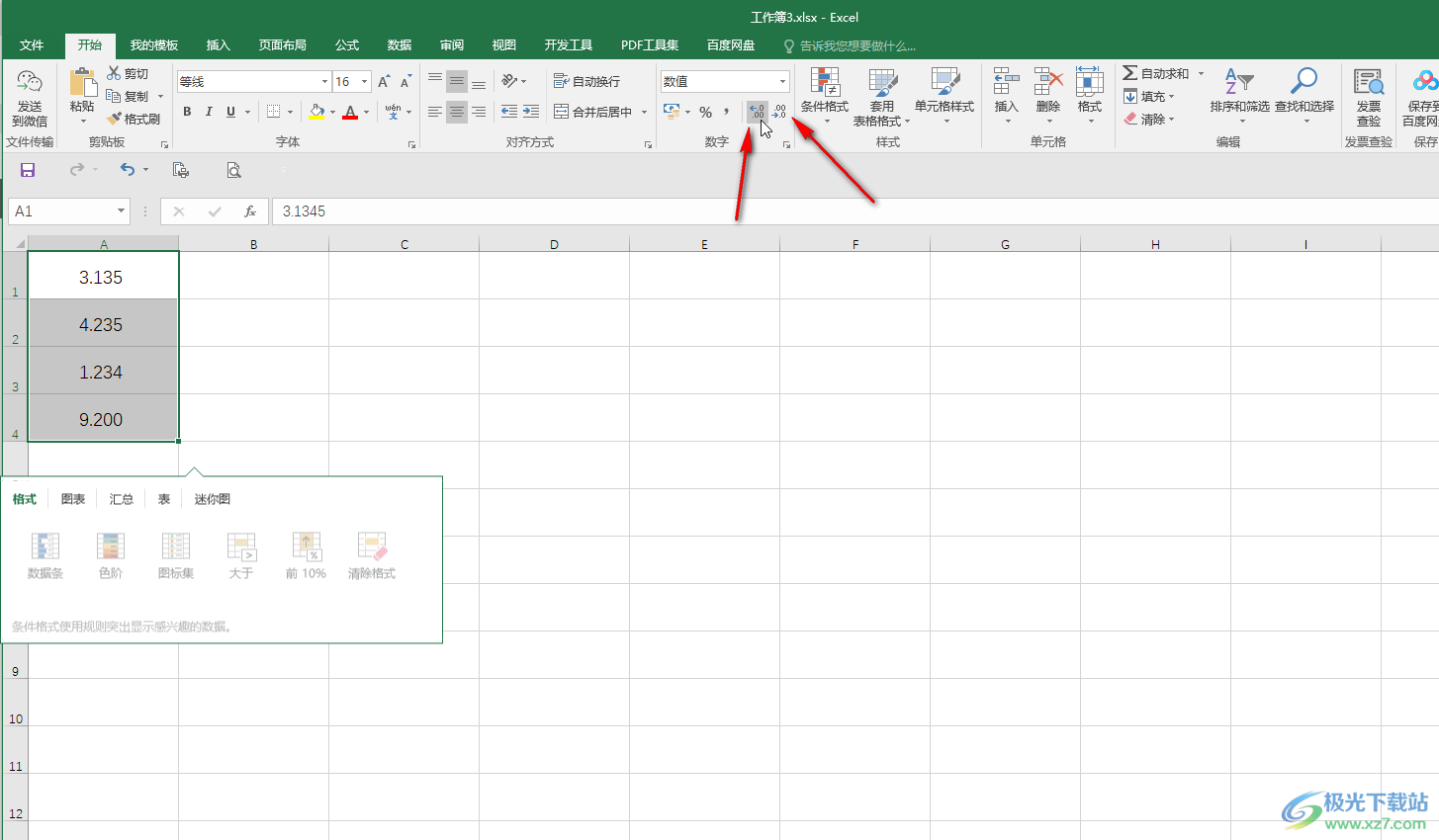 第五步:另外,我们还可以在“开始”选项卡的“数字”栏,点击如图所示的图标增加或者减少小数位数。