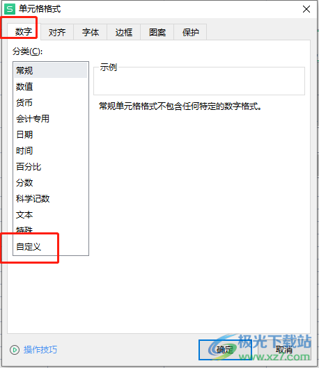 3.这时进入到单元格格式窗口,在默认的数字选项卡中用户点击分类板块中的自定义选项