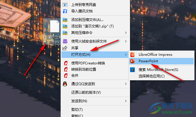 1、第一步,我们先在电脑中找到一个演示文稿,然后右键单击选择“打开方式”,再在打开方式的列表中点击“powerpoint”选项