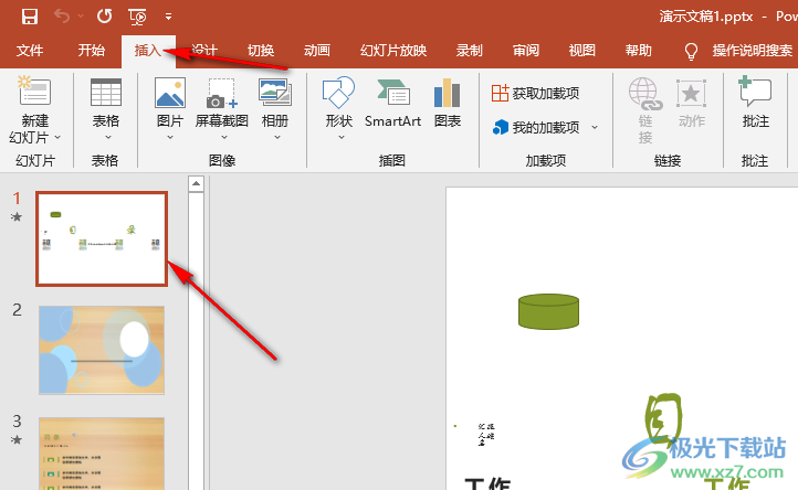 2、第二步,进入PPT页面之后,我们在该页面中点击一个幻灯片,然后在工具栏中打开“插入”工具