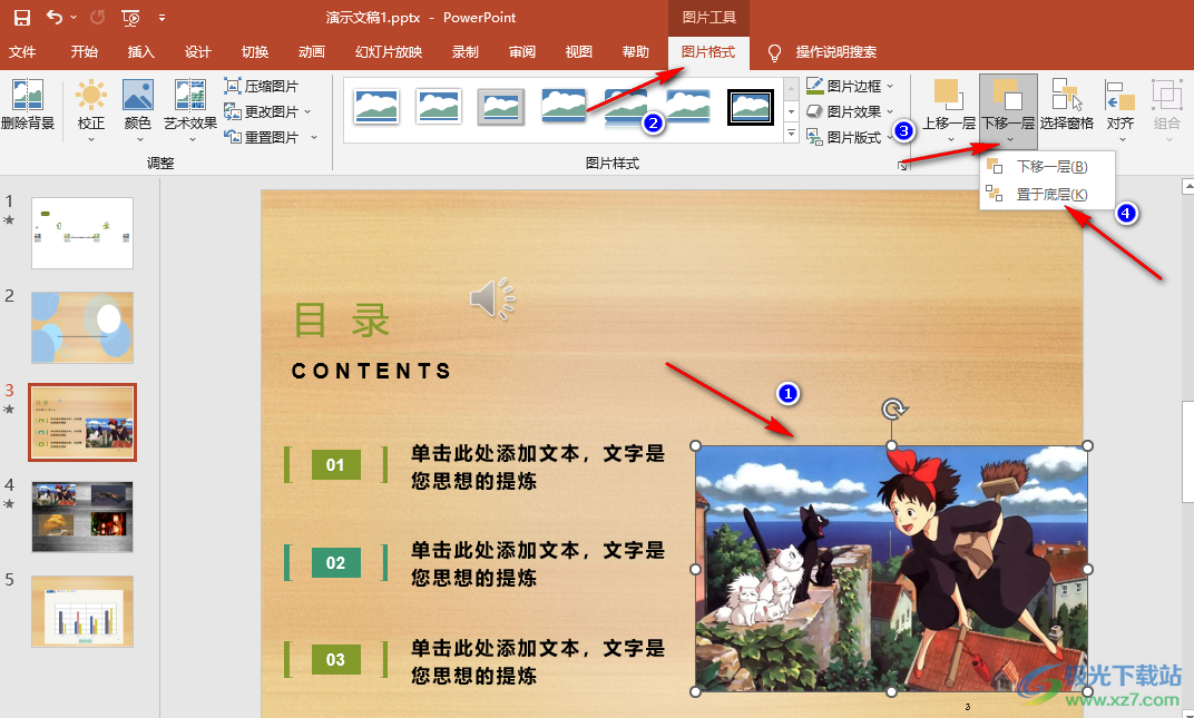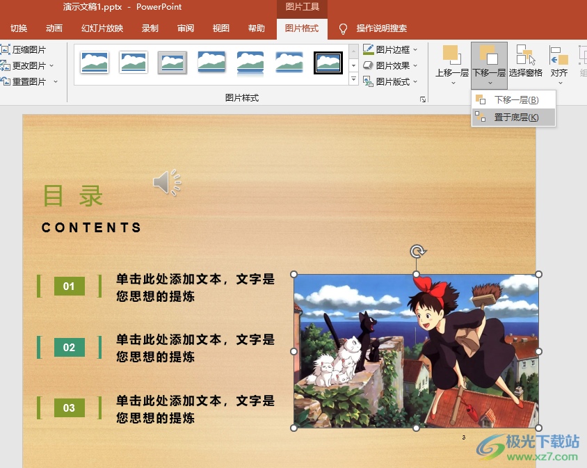 4、第四步,插入图片之后,我们点击图片,再点击“图片格式”选项,接着打开下移一层选项,并在下拉列表中点击“置于底层”选项