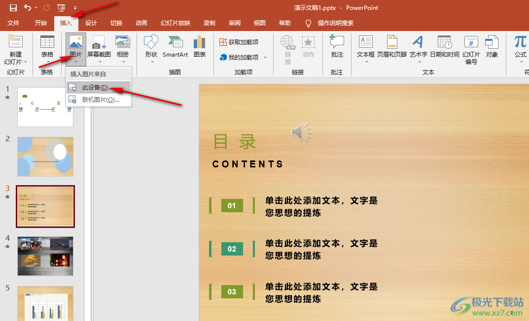2、第二步,进入PPT页面之后,我们在该页面中先点击工具栏中的“插入”选项,然后在子工具栏中再打开“图片”选项,并在下拉列表中下选择“此设备”选项