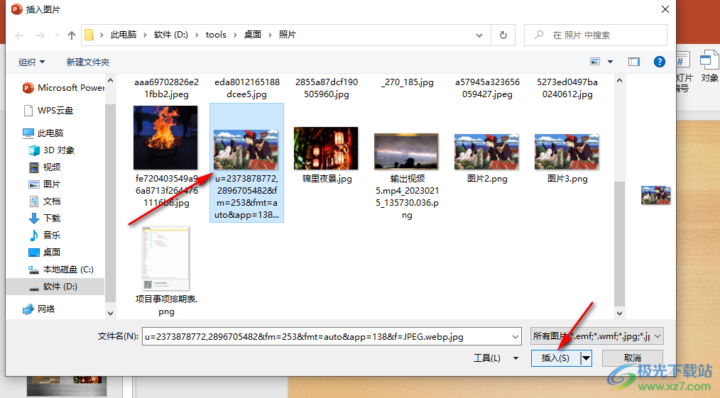 3、第三步,进入文件夹页面之后,我们在文件夹中找到自己想要添加的图片,然后点击“插入”选项