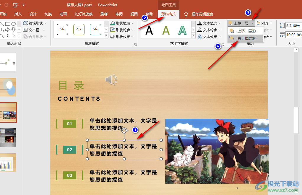 5、第五步,文字也是同样的操作,我们选中文本框,然后打开形状格式选项,再打开“上移一层”选项,最后在下拉列表中点击“置于顶层”选项即可,设置好上下层之后,我们调整图片的大小与位置,将其放在文字附近即可