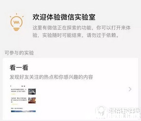 ;看一看”和;搜一搜”获得;微信第一入口”黄金位置。新版微信在;设置”界面中增添了;实验室”入口,点击进入后发现以下字眼:;欢迎体验微信实验室,这里有微信正在探索的功能,你可以打开来体验,实验随时可能结束,请勿过于依赖。”