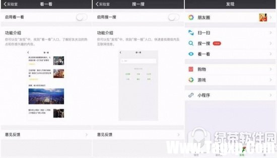 启用后,;看一看”和;搜一搜”的入口均出现在微信;发现”的下一级菜单,且比;购物”、;游戏”和;小程序”的位置还要高,位置仅次于;朋友圈”和;扫一扫”。