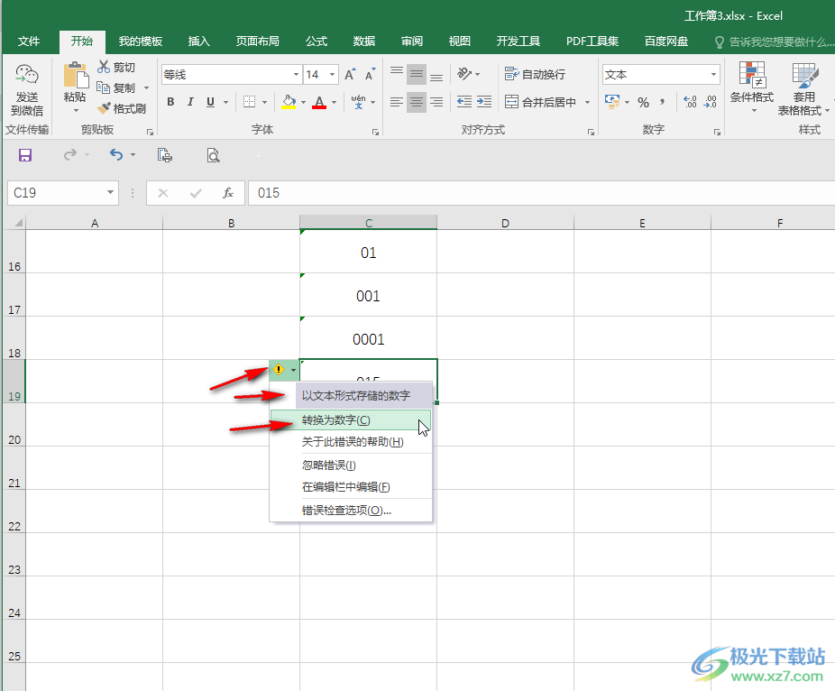 第四步:可以看到这些单元格左上方有一个绿色的小图标,点击该单元格会出现一个黄色的图标,点击一下可以看到信息提示,如果后续需要进行计算等操作,我们可以将其转换为正常数字格式;