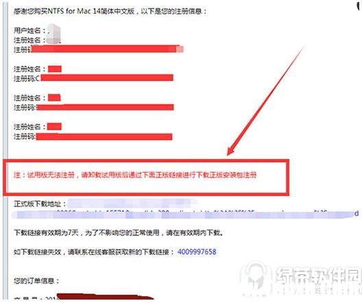 在邮件注册信息下方有一行提醒:试用版无法注册,请卸载试用版本后通过下面的正版链接进行下载正版安装包注册激活。