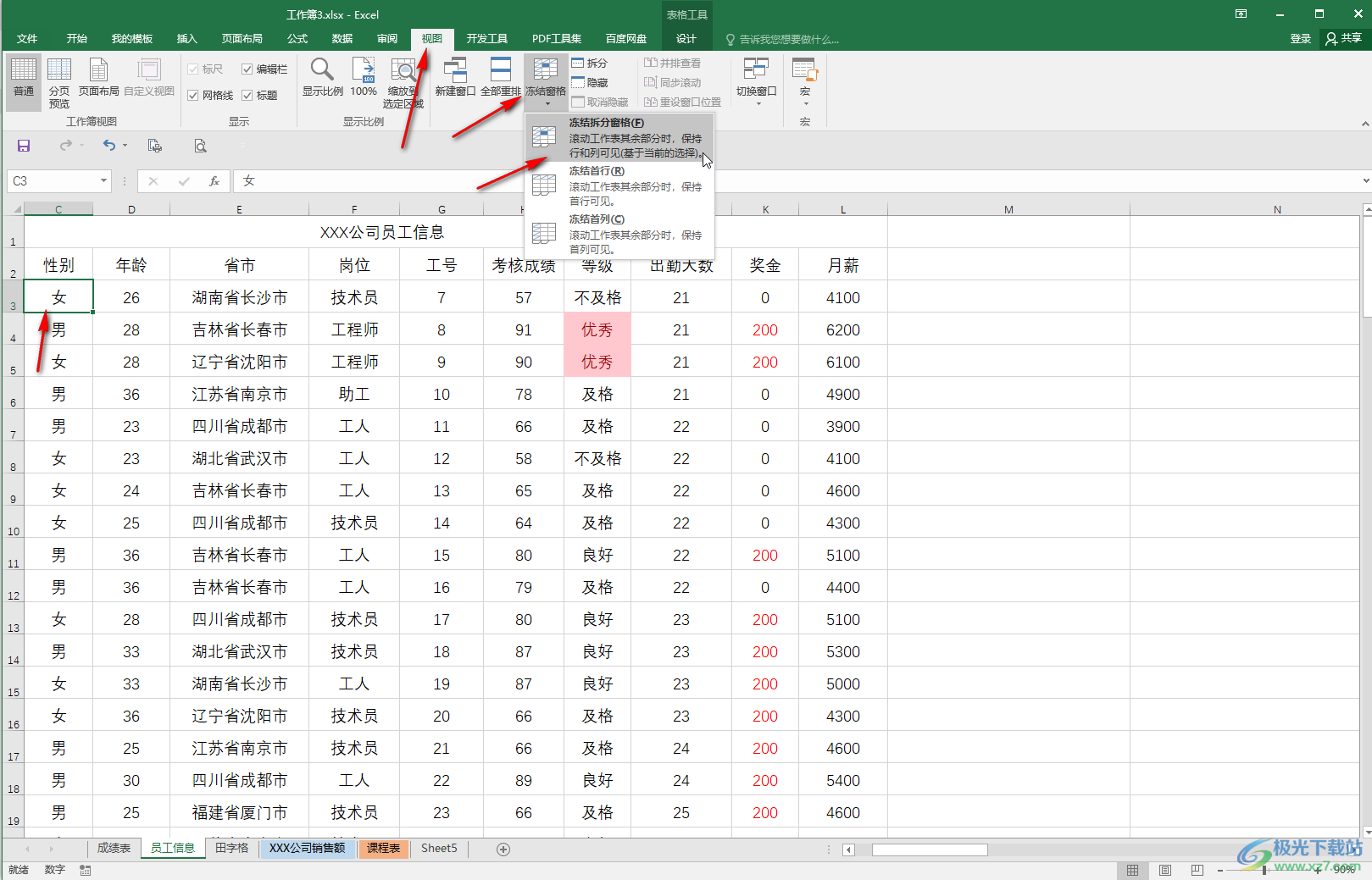 第二步:点击选中第三行的单元格,接着点击“视图”选项卡中的“冻结窗格”按钮并在子选项中点击“冻结拆分窗格”就可以了;