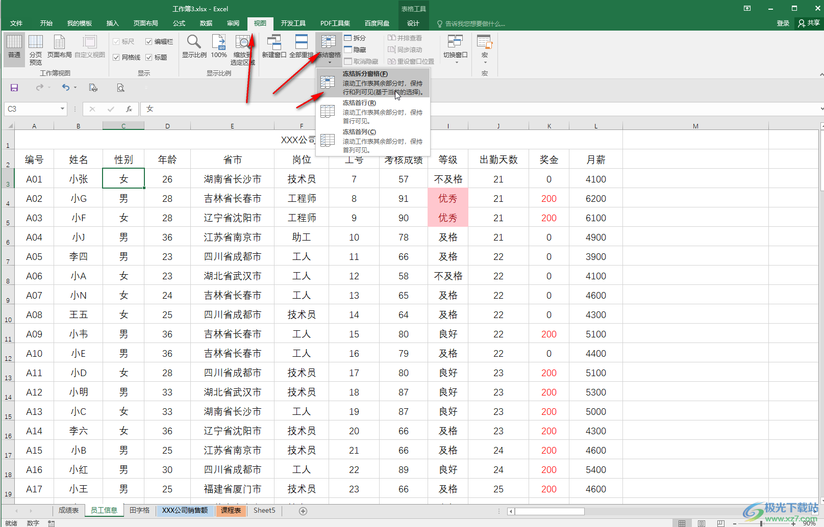 第三步:然后在“视图”选项卡中点击“冻结窗格”——“冻结拆分窗格”;