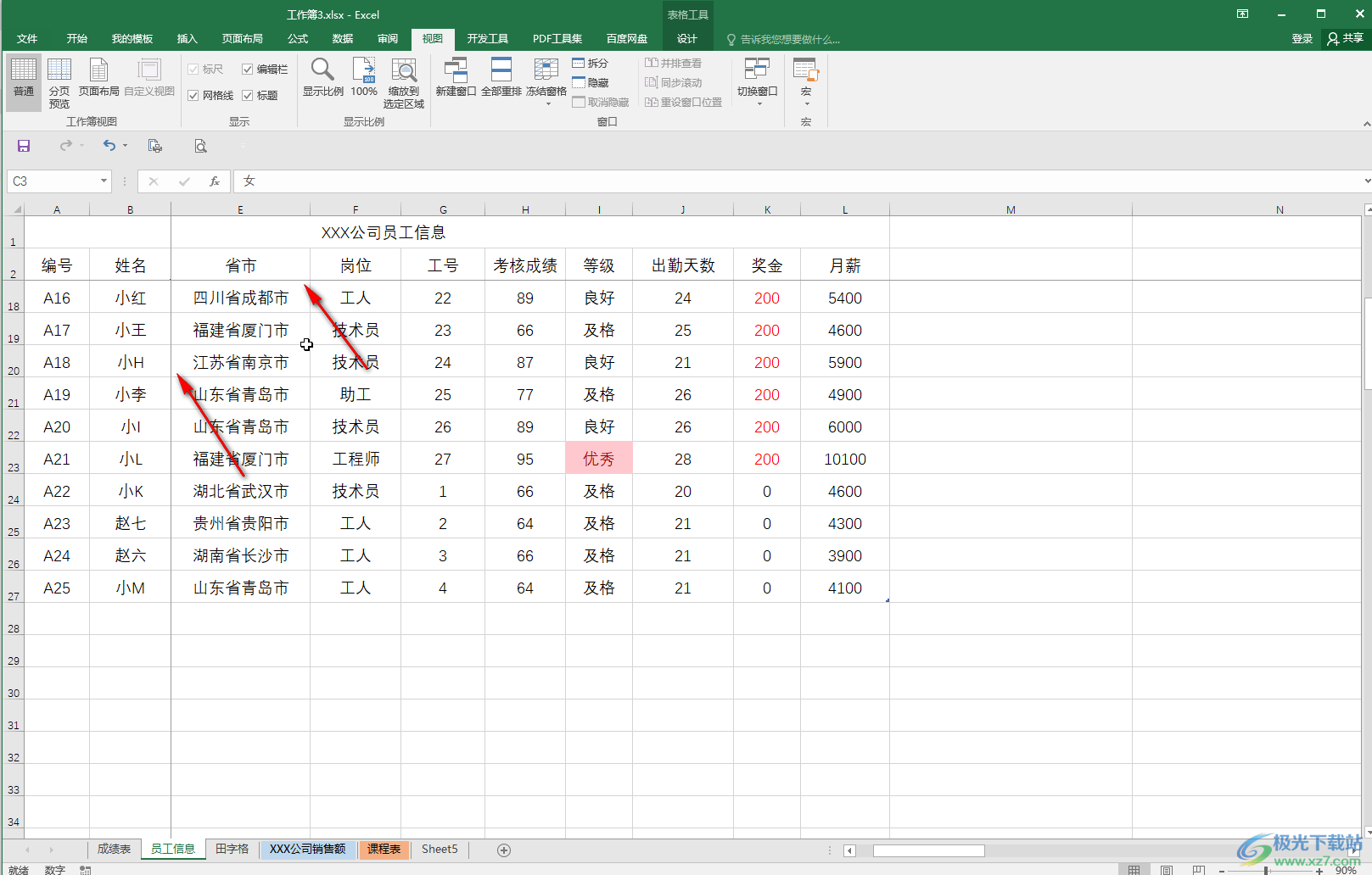 第二步:如果我们需要冻结前两行和前两列,就点击选中前两行和前两列交叉处右下角的单元格,我们这里是C3单元格;