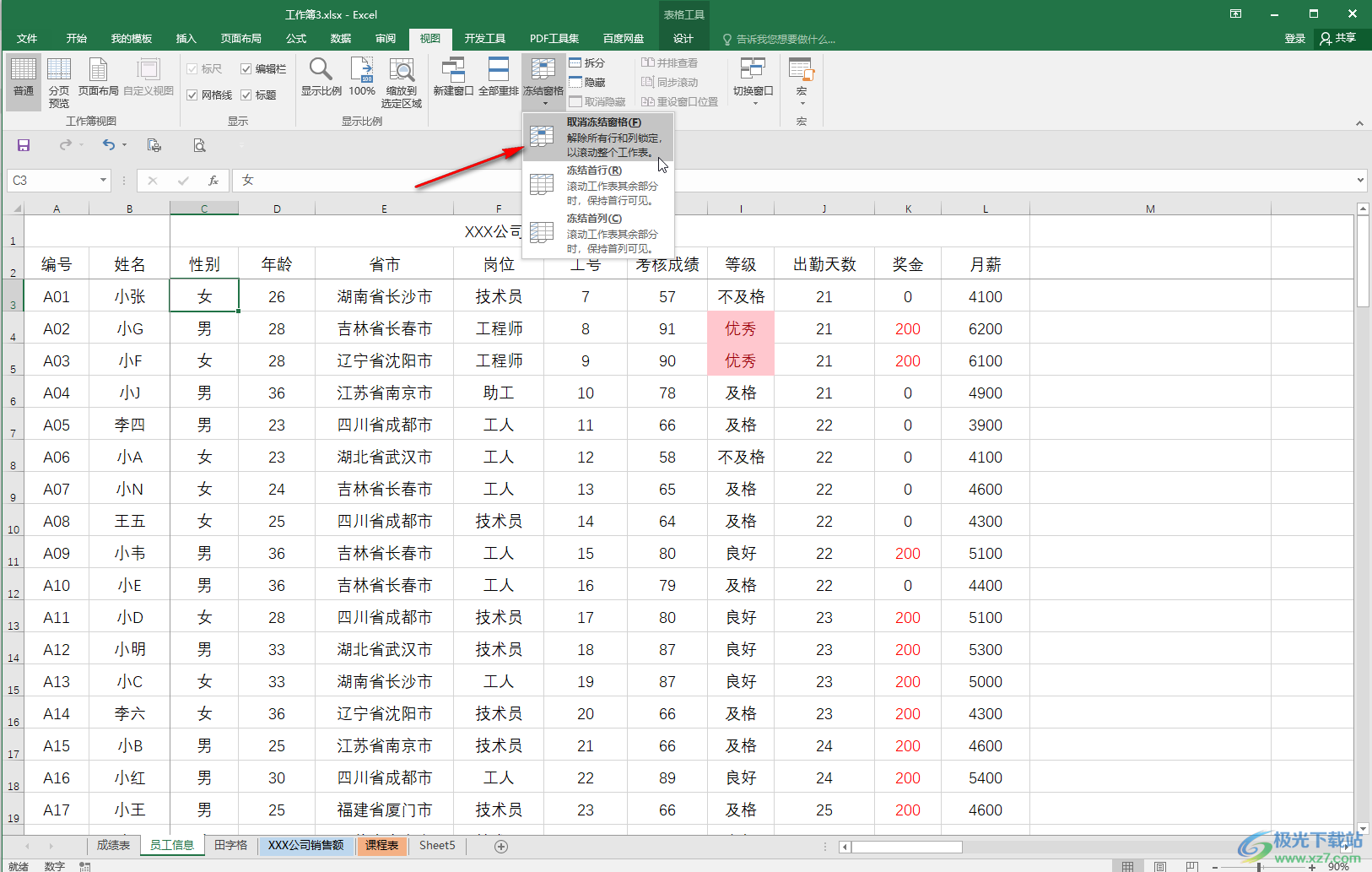 第五步:后续可以点击“取消冻结窗格”按取消冻结状态。