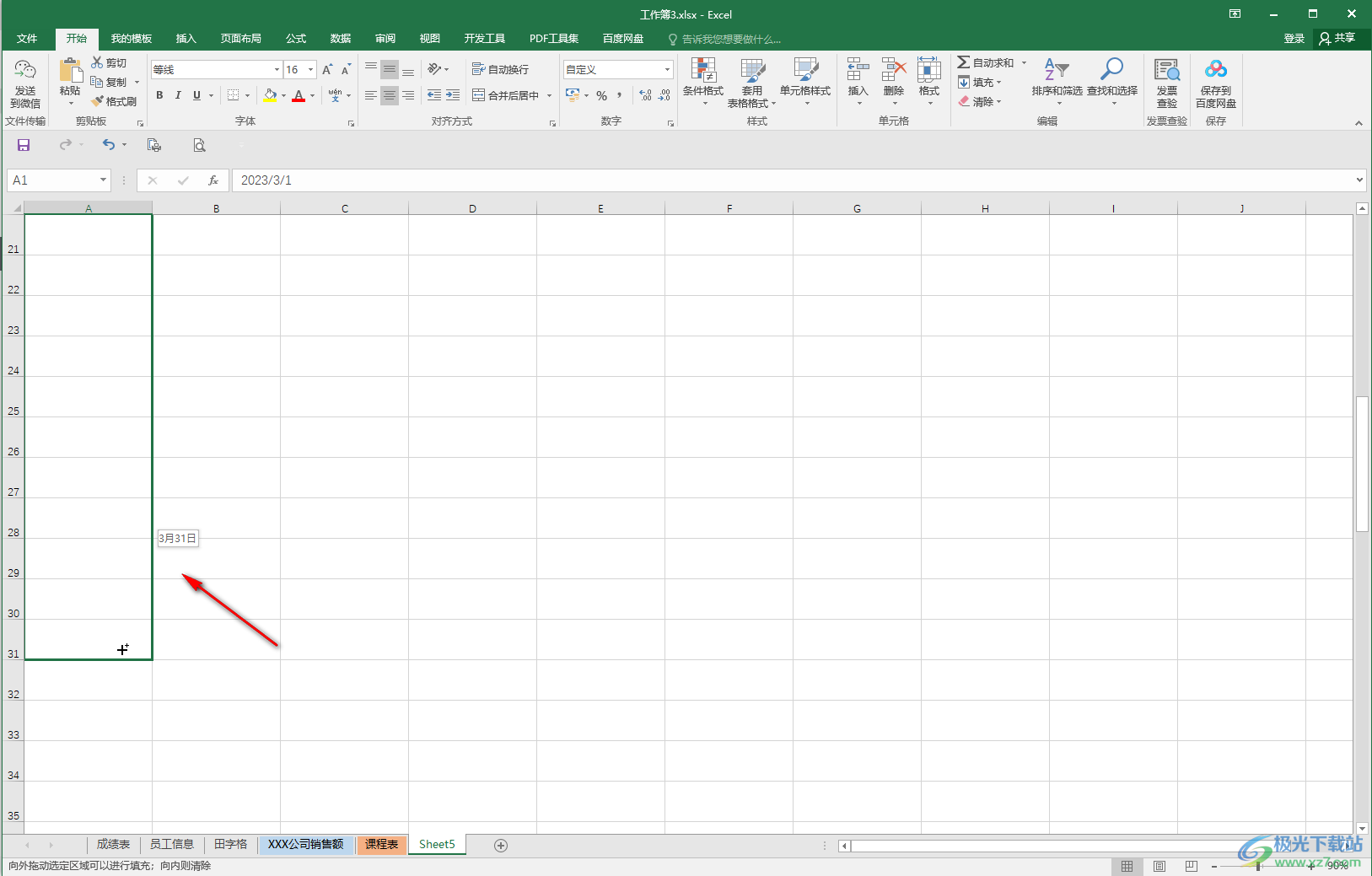 第二步:方法1.点击选中该单元格后,使用鼠标左键拖动该单元格右下角的小方块,可以看到日期的增加;