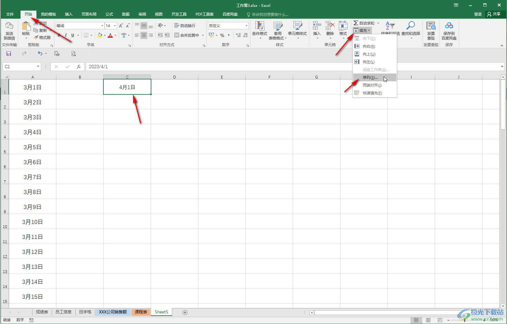 第四步:方法2.手动输入第一个日期后,在“开始”选项卡中点击“填充”按钮并在子选项中点击“序列”;