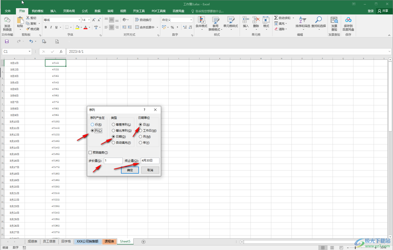 第五步:在窗口中点击“列”,然后点击“日期”——“日”,步长值设置为1,输入终止值并进行确定就可以了。