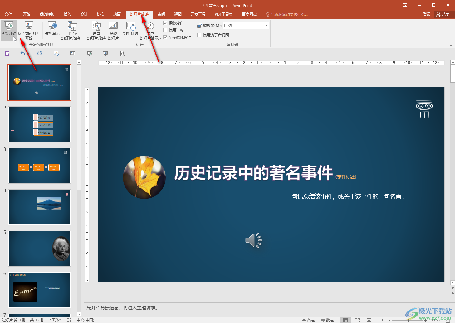 第四步:后续可以点击“幻灯片放映”选项卡中的“从头开始”按钮进入放映视图后查看效果;
