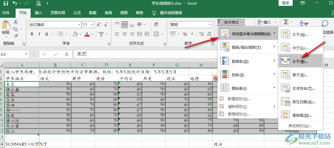 3、第三步,我们打开“条件格式”工具之后,在下拉列表中点击选择“突出显示单元格规则”选项,再在该选项的子菜单列表中点击选择“介于”选项