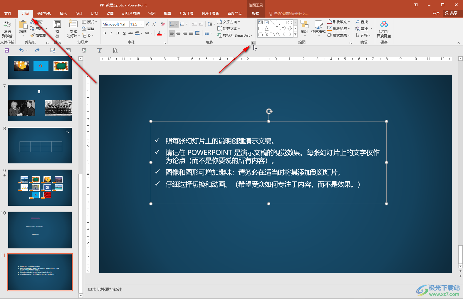第一步:打开PPT,选中文段内容后在“开始”选项卡中点击项目符号处的下拉箭头可以根据需要选择想要的项目符号进行添加;