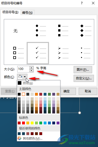 第五步:在“项目编号”图标的子选项中点击“项目符号和编号”按钮还可以点击打开窗口,设置项目符号的大小和颜色。