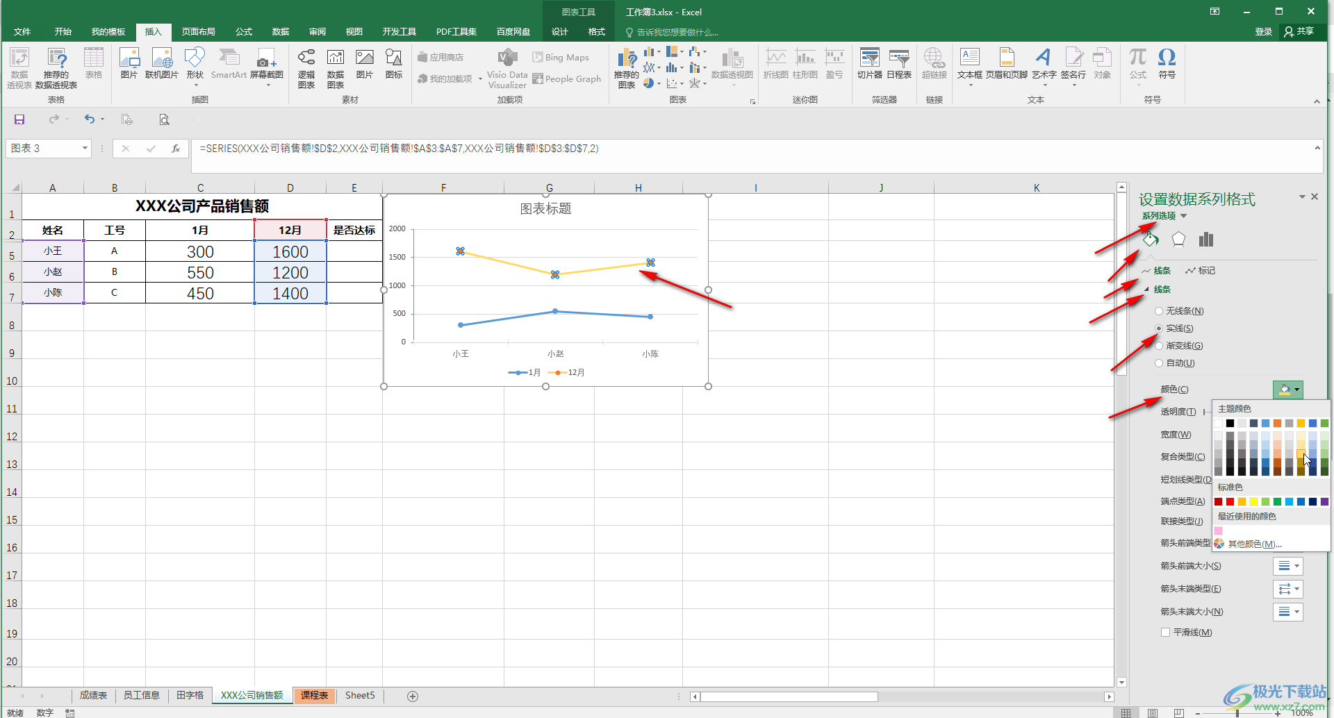 第三步:点击需要修改颜色的折线条,在侧边栏中点击“填充与线条”图表后在子选项中点击“线条”——“线条”,然后选择“实线”,在“颜色”处点击右侧的下拉箭头选择想要的颜色就可以了;