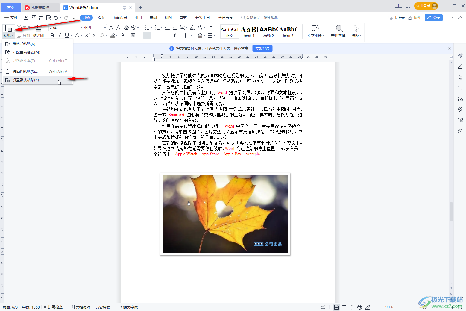 第二步:在“开始”选项卡中点击“粘贴”处的下拉箭头并在子选项中点击“设置默认粘贴”;