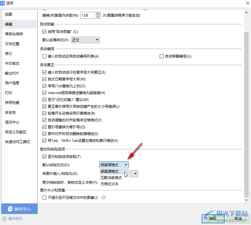 第三步:在打开的窗口中点击“默认粘贴方式”处的下拉箭头,根据需要选择想要的格式,比如我们这里点击选择“保留源格式”;
