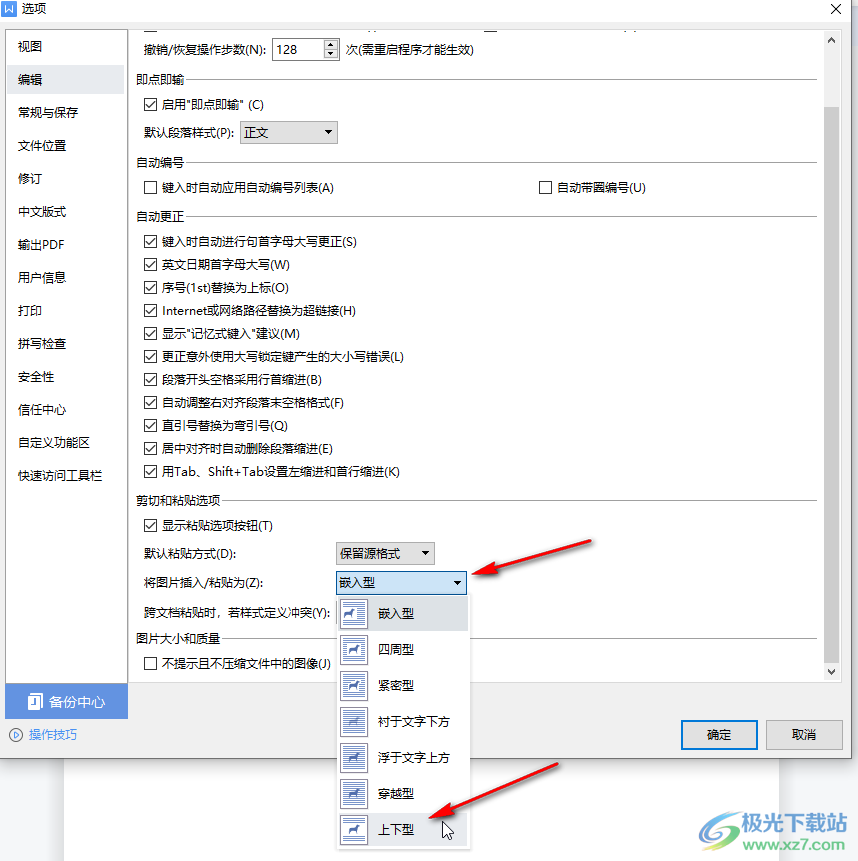 第四步:在下方还可以设置图片的默认插入/粘贴格式,比如我们可以设置为“上下型”,这样就可以直接拖动调整图片的位置了;