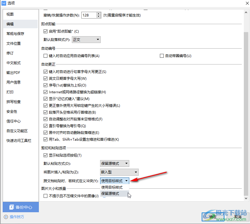 第五步:点击“跨文档粘贴时,若样式定义冲突”处的下拉箭头,也可以设置跨文档粘贴时的默认格式。