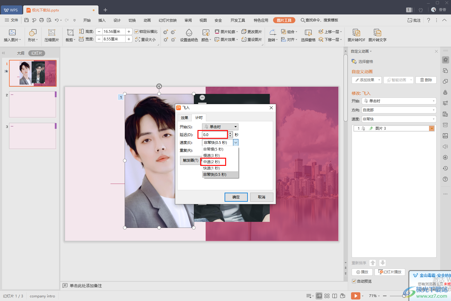 wps这款软件是我们平时都在使用的一款办公软件,我们通常会使用WPS PPT编辑工具进行幻灯片的一个制作,我们想要将幻灯片进行制作成一个提案或者是文稿来显示,而在制作幻灯片的过程中就会插入一个图片、文字等之类的内容,有时候我们会给图片添加一个动画效果来显示,这样的话可以让我们的图片在播放的过程中有一个动画的效果显示出来,是比较个性化的,当我们设置了动画效果之后,发现在播放的时候,动画效果的速度显示得比较快,那么怎么将速度调慢一点呢,下面是小编给大家分享的关于如何使用WPS PPT设置动画效果速度的具体操作方法,如果你需要的情况下可以看看方法教程,希望可以对大家有所帮助。