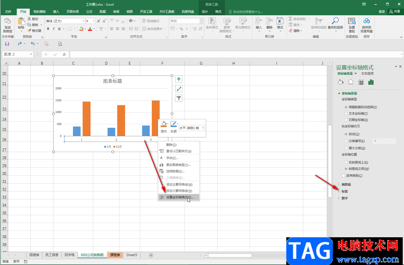 第二步:点击选中横坐标轴后右键点击一下,在子选项中点击“设置坐标轴格式”,然后在打开的侧边栏中点击展开“标签”;