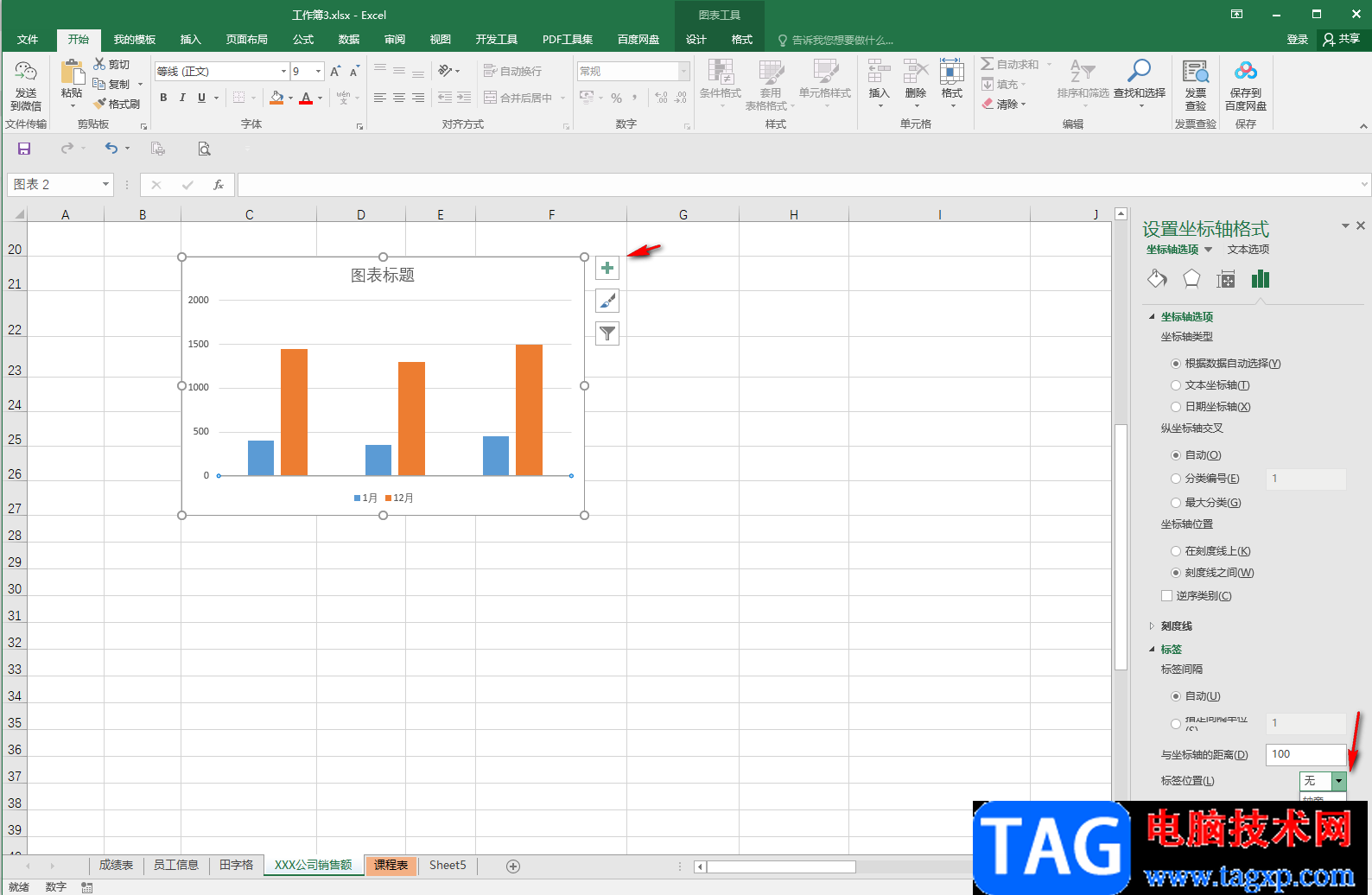 第三步:然后点击“标签位置”右侧的下拉箭头,选择“无”将其删除,或者也可以在图表右上方点击加号图标后取消勾选“横坐标轴”;