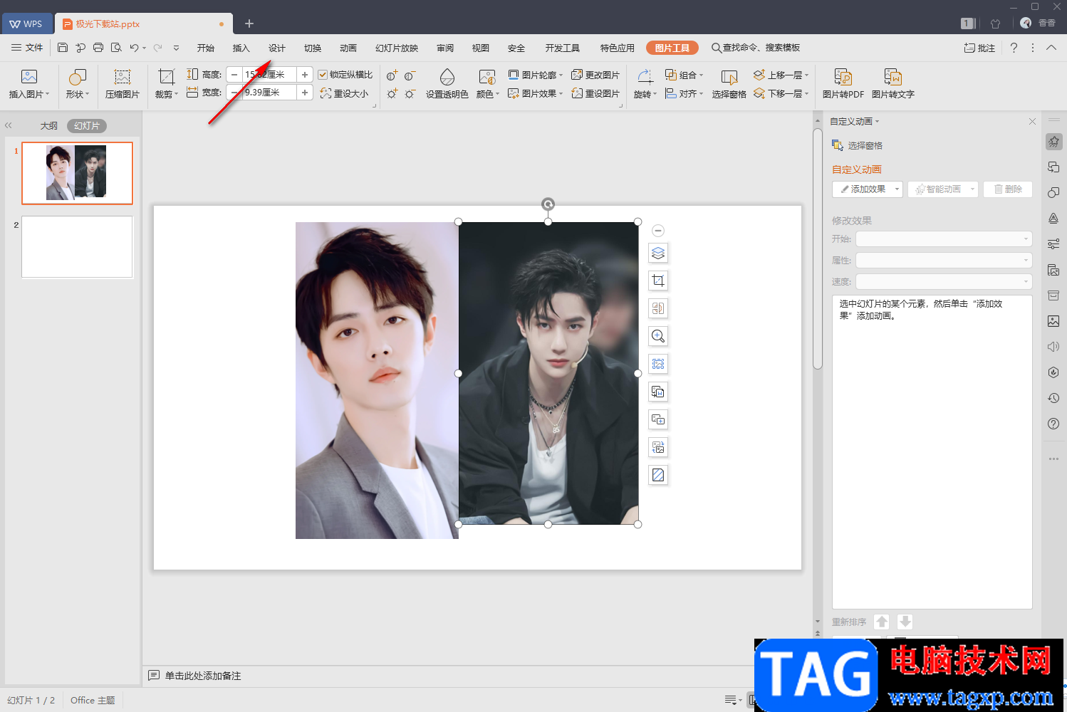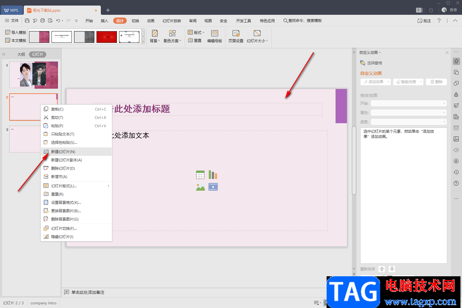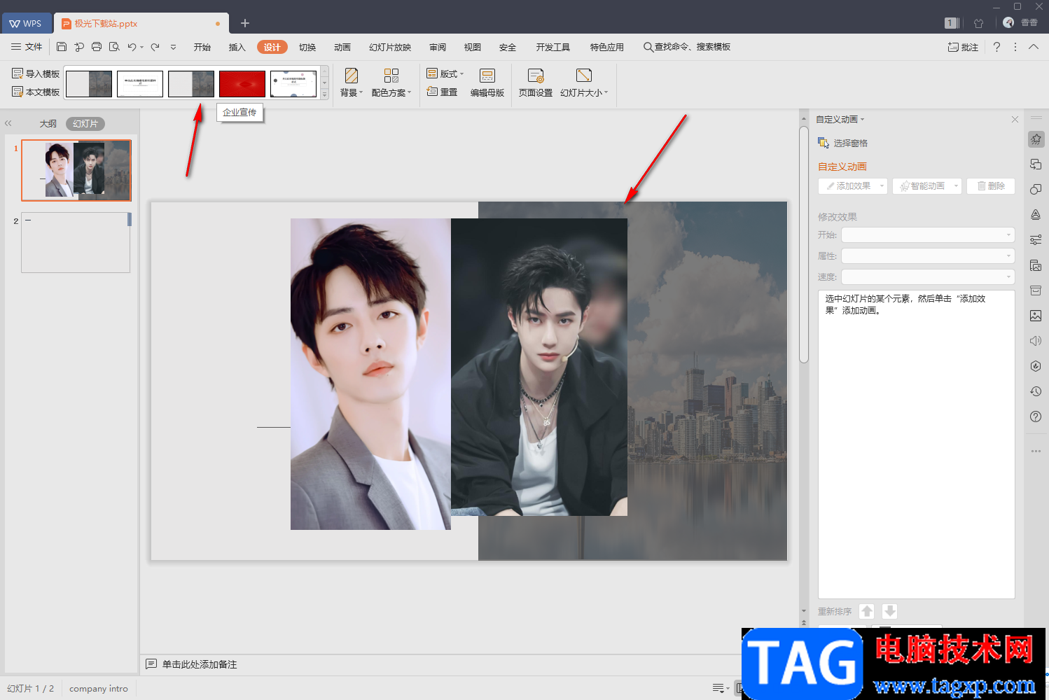 1.将我们的WPS PPT办公软件打开,然后在幻灯片中进行编辑内容,想要设置主题效果的话,点击【设计】选项进行设置。