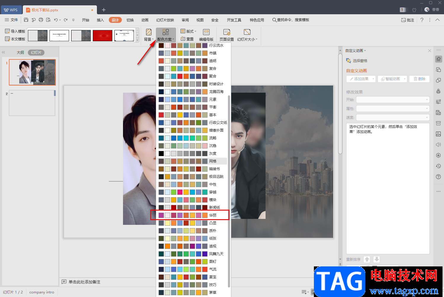 3.接着我们将【配色方案】这个选项按钮点击一下,在弹出的窗口中有很多的颜色可以选择,用鼠标滑动该窗口,找到自己需要的【华丽】配色方案,找到之后可以看到有多种颜色可以选择。