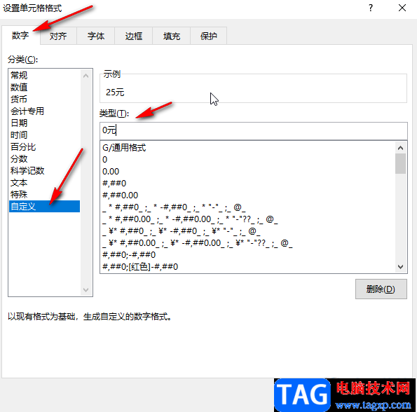 第二步:在窗口上方点击切换到“数字”栏,然后选择“自定义”,接着在“类型”处输入0和需要添加的单位并进行确定;