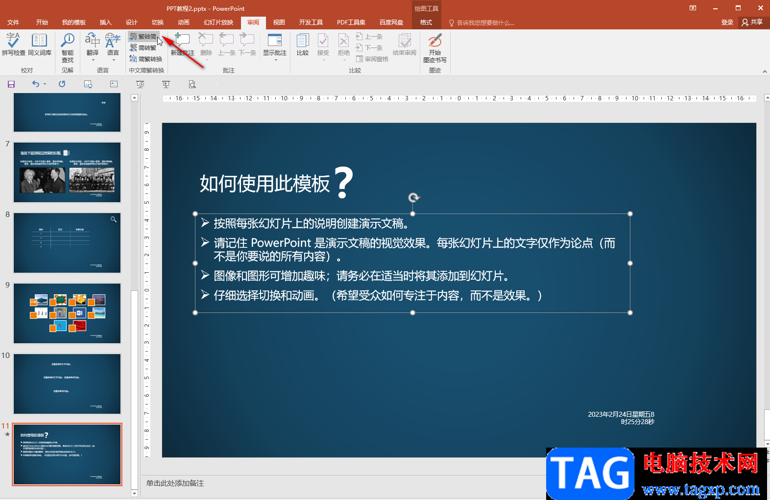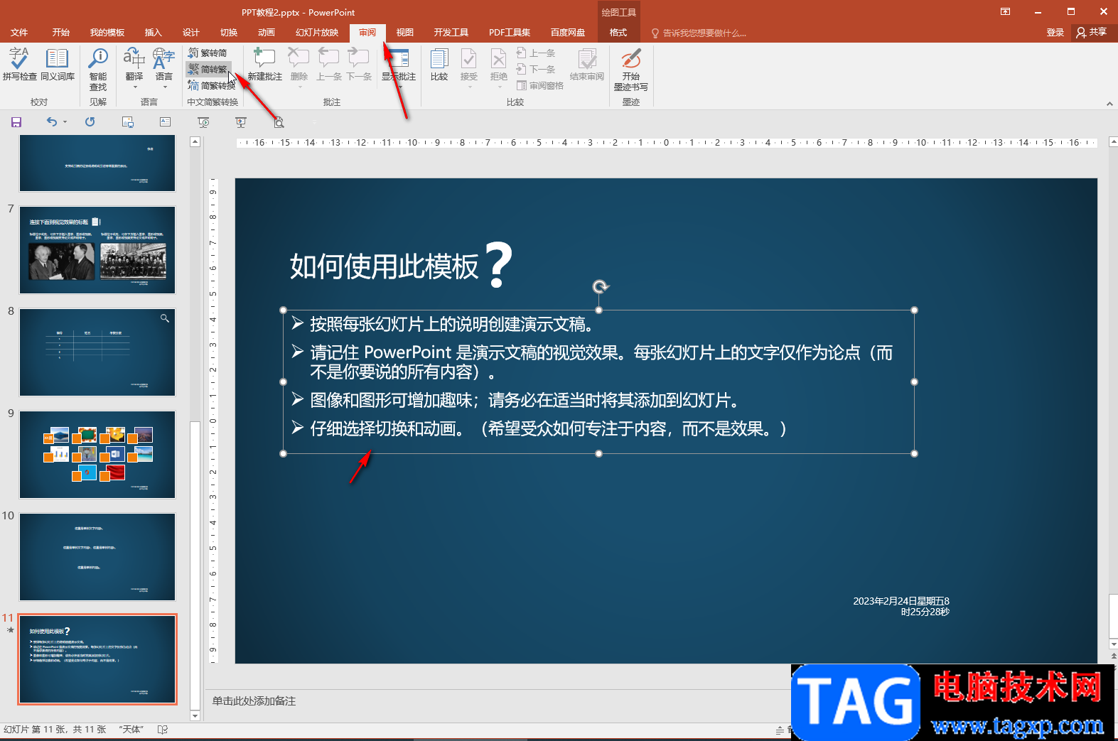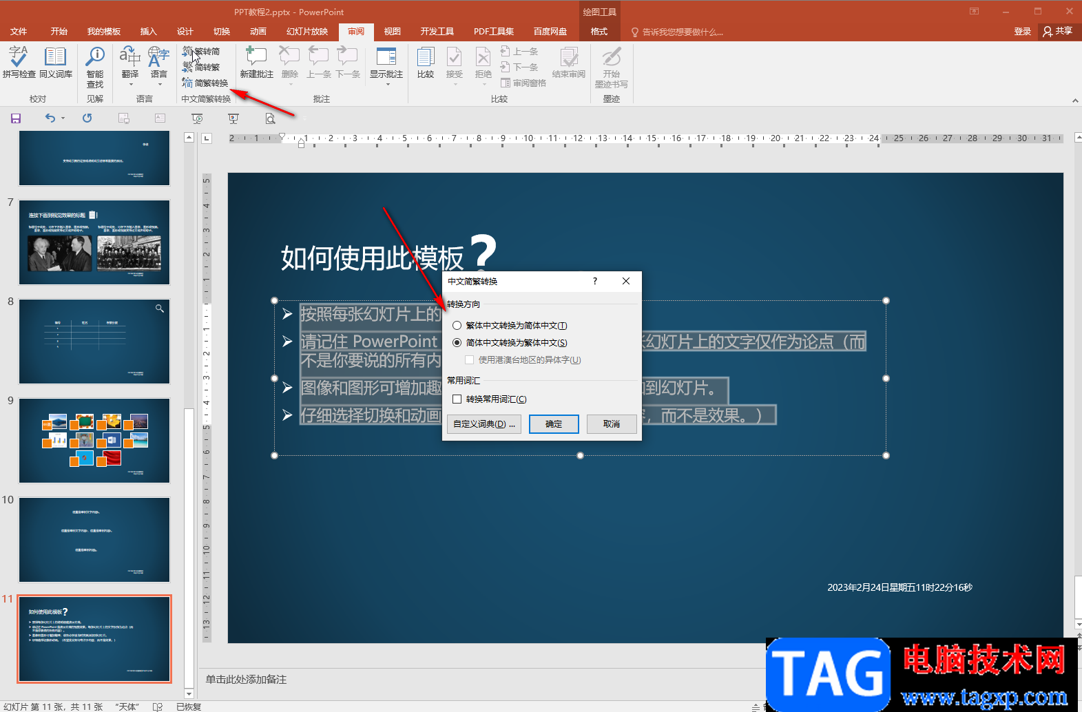 以上就是PowerPoint演示文稿中把简体字转换为繁体字的方法教程的全部内容了。使用“审阅”中的“翻译”功能,我们可以将内容翻译为英文等语言,小伙伴们可以按需操作。