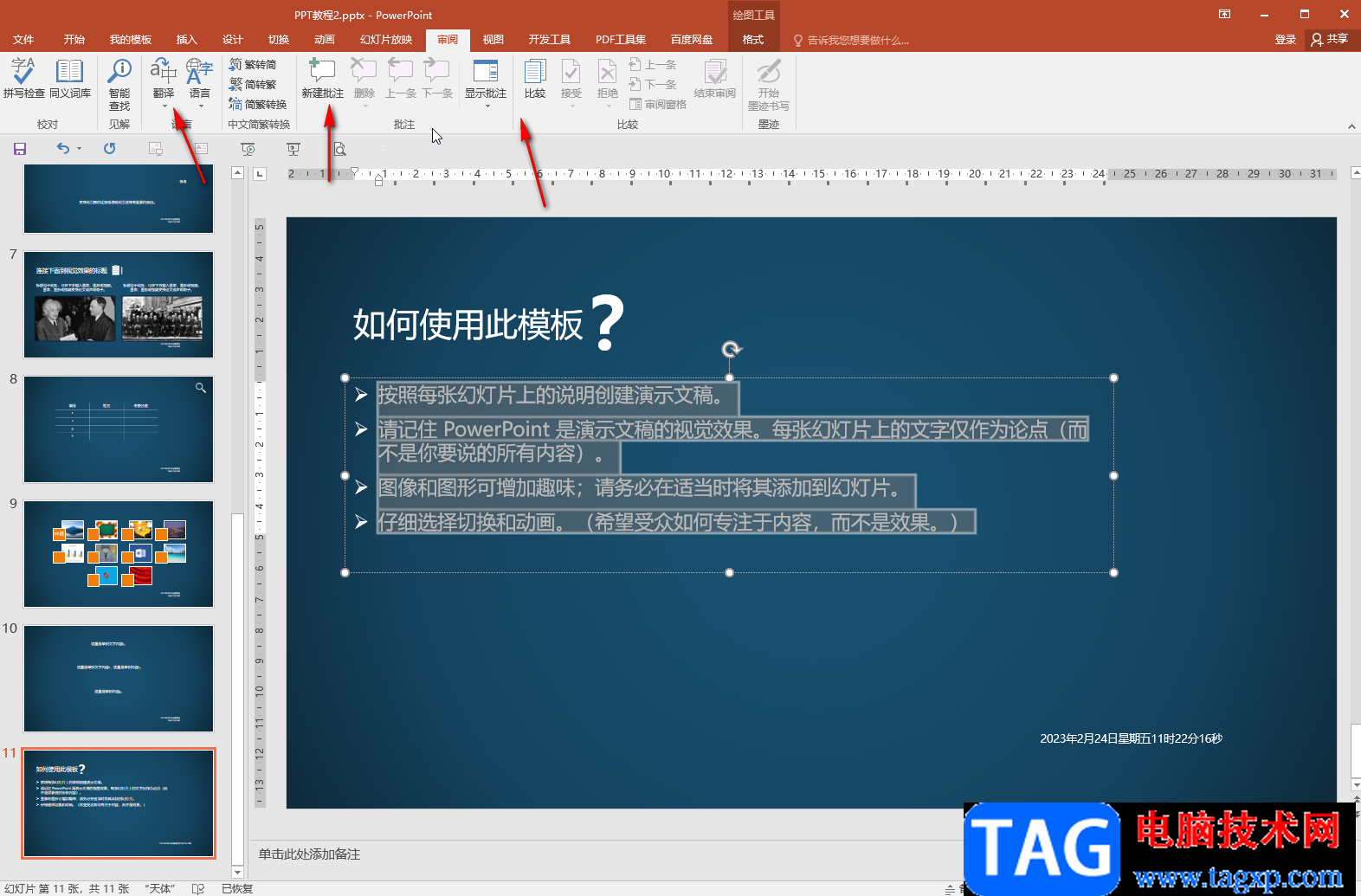 第五步:在“审阅”选项卡中我们还可以点击使用“翻译”,“新建批注”,“显示批注”,“比较”等功能。