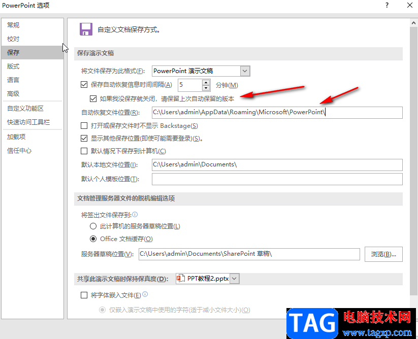 第五步:然后点击勾选“如果我没保存就关闭,请保存上次自动保留的版本”就可以了,在下方可以看到自动恢复文件位置,后续可以按此路径查找自动保存的文件。